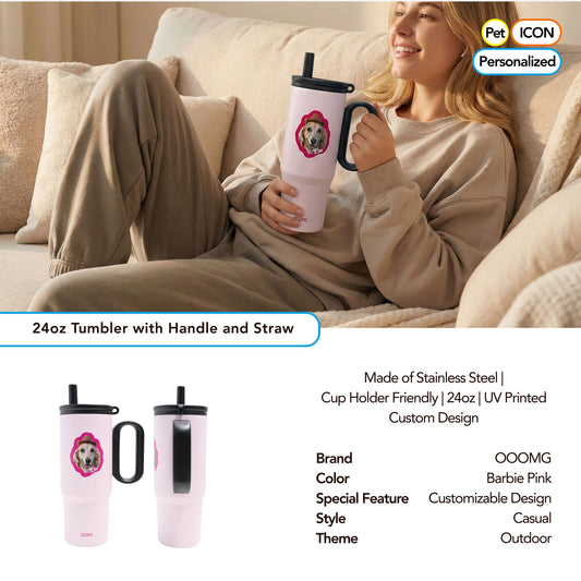 Barbie Pink Custom Pet Portrait Tumbler - Personalized Dog&Cat - Themed Insulated Travel Mug with Handle and Straw Lid