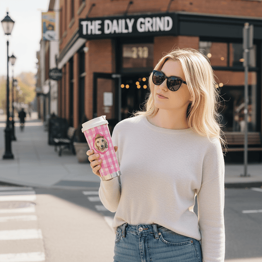 Personalized Pink Gingham Pet Portrait Travel Tumbler – Insulated Stainless Steel Coffee Mug with Pop-Up Straw & Carrying Strap